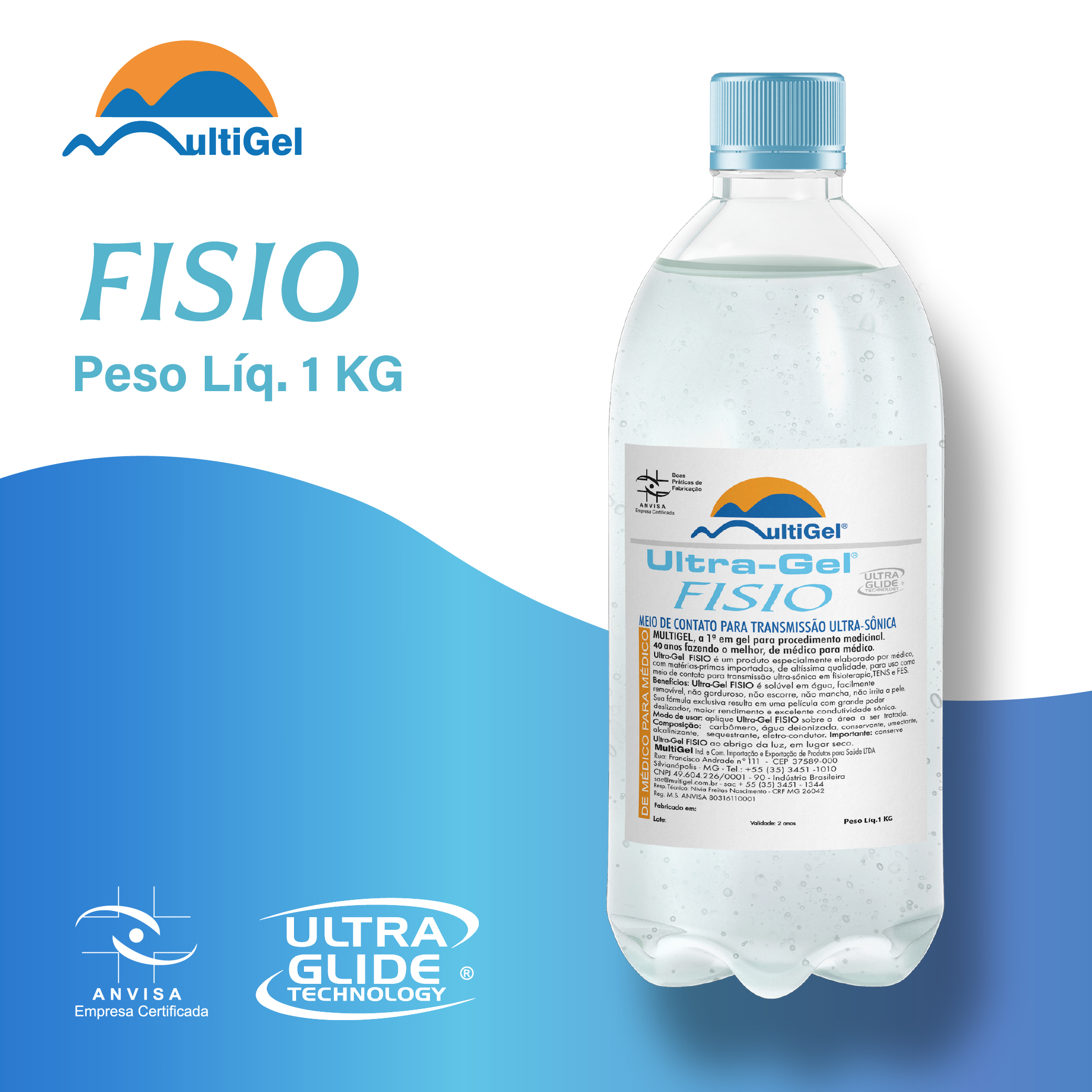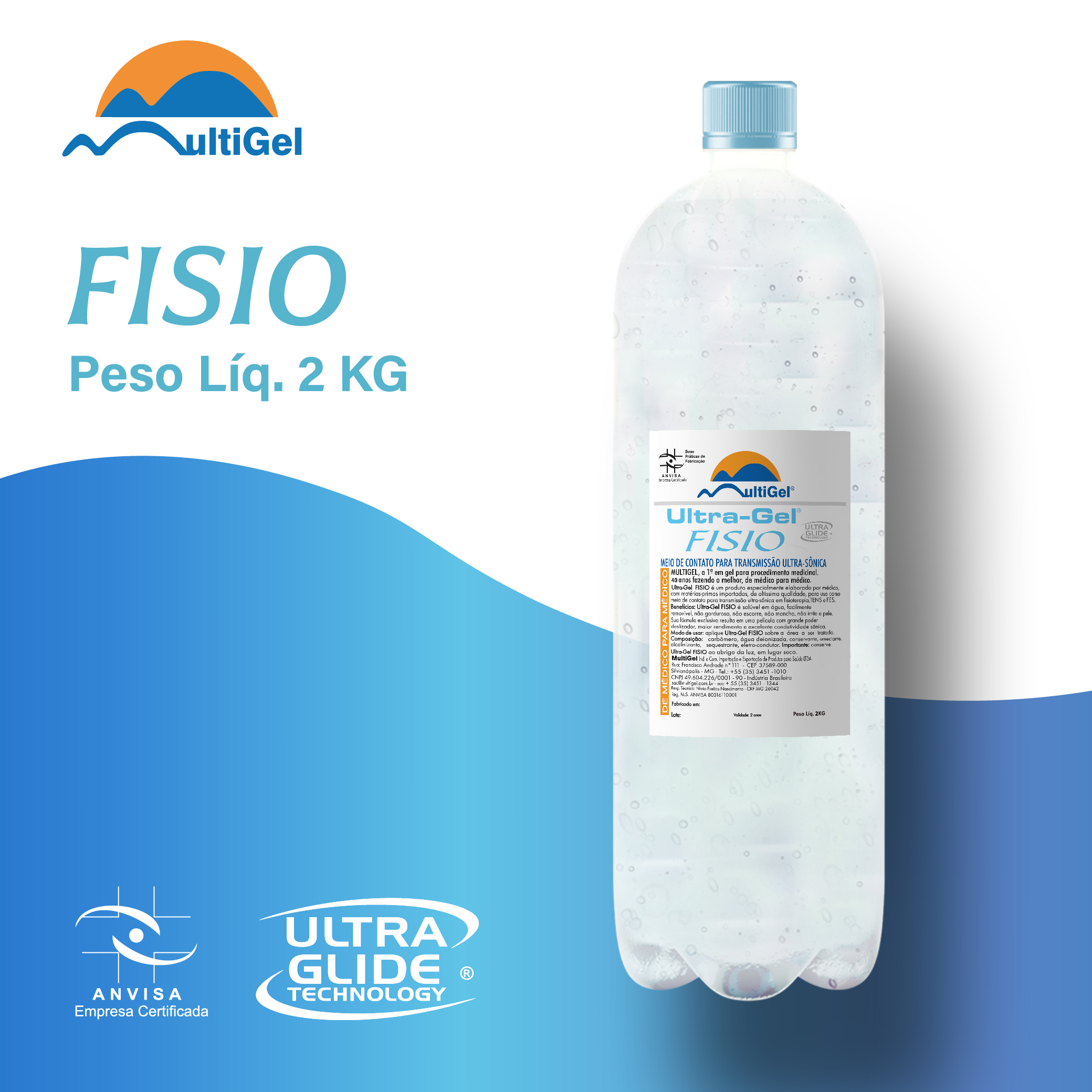 O Ultra-Gel FISIO é solúvel em água, facilmente removível, não gorduroso, não escorre, não mancha e não irrita a pele. Sua fórmula exclusiva resulta em uma película com grande poder deslizante, maior rendimento e excelente condutividade sônica.