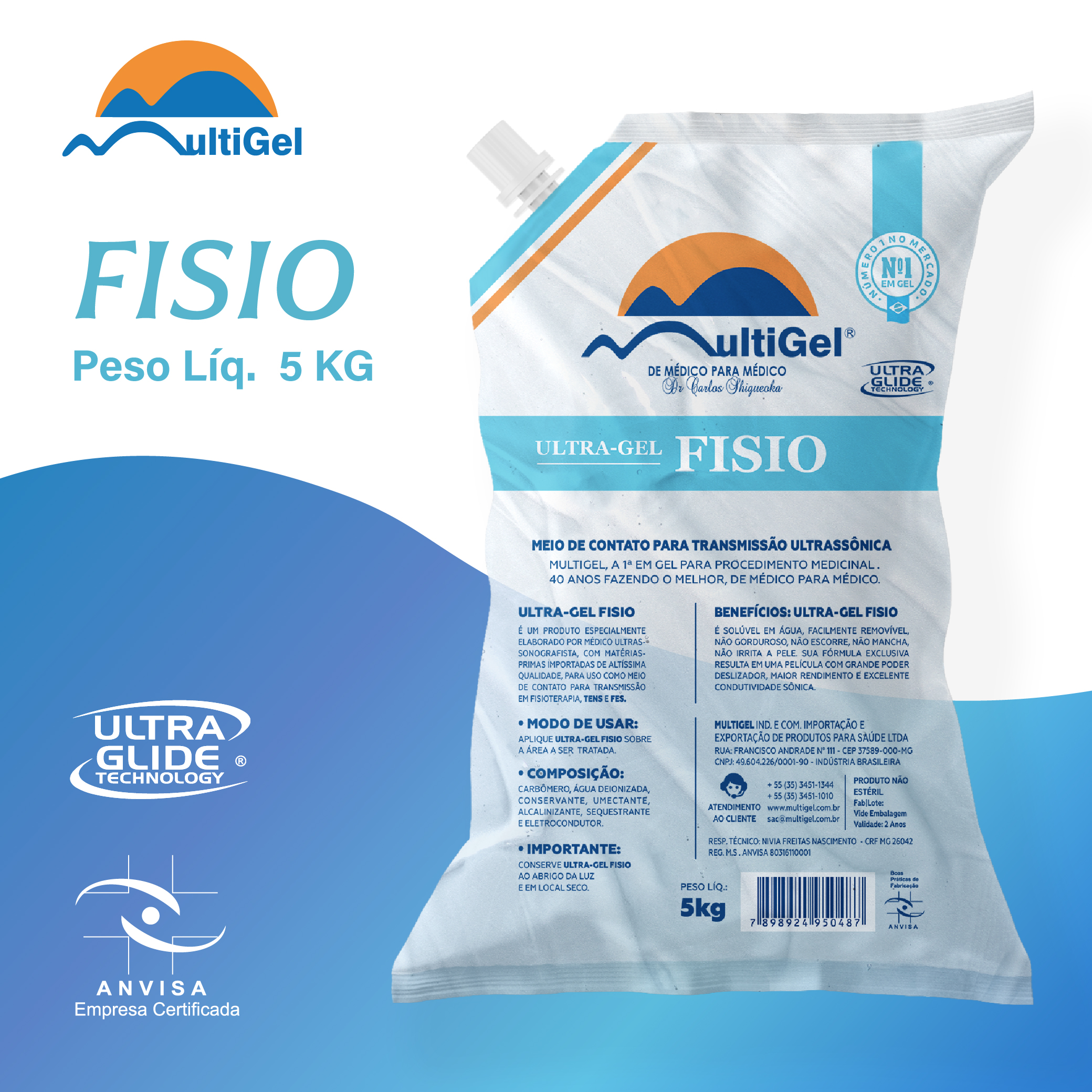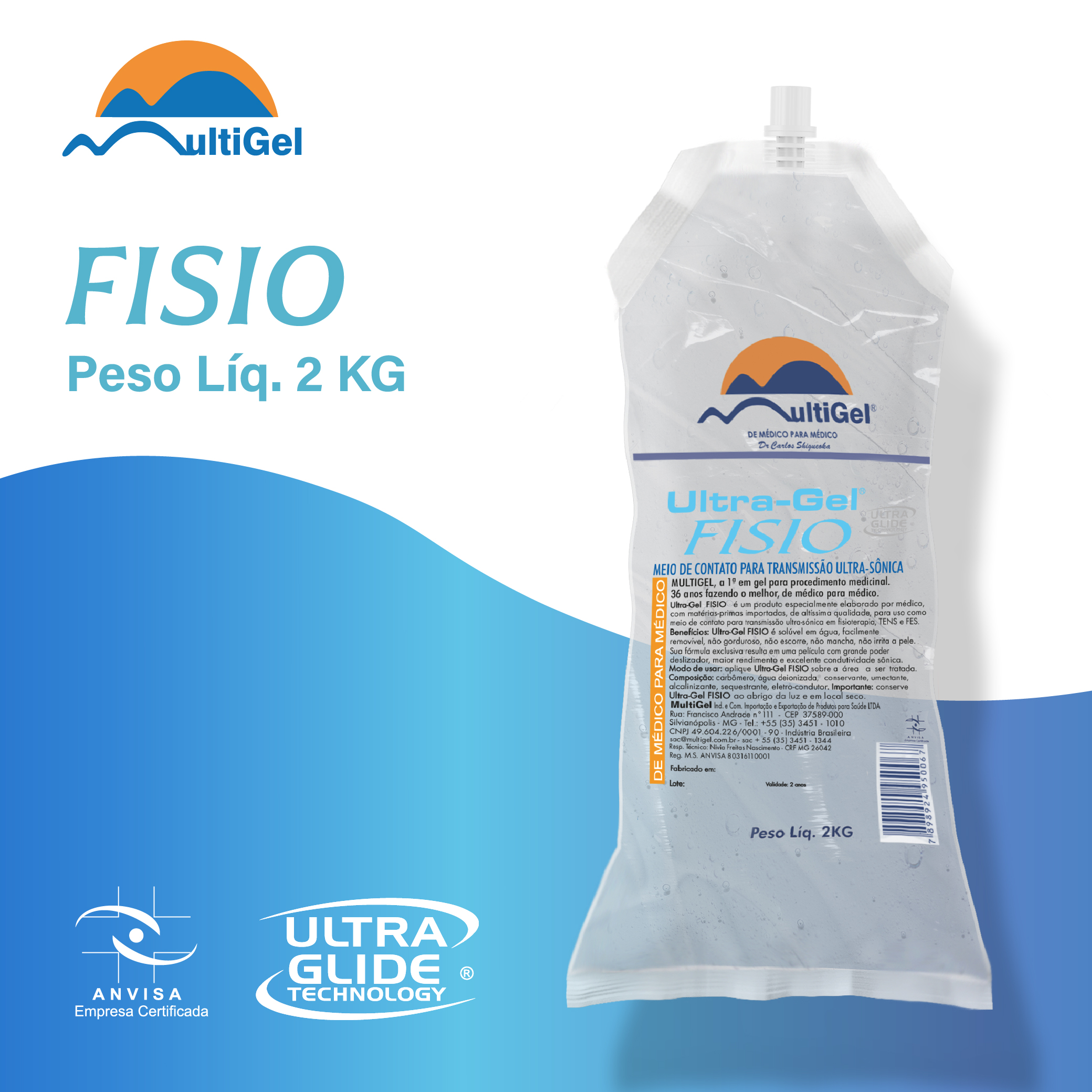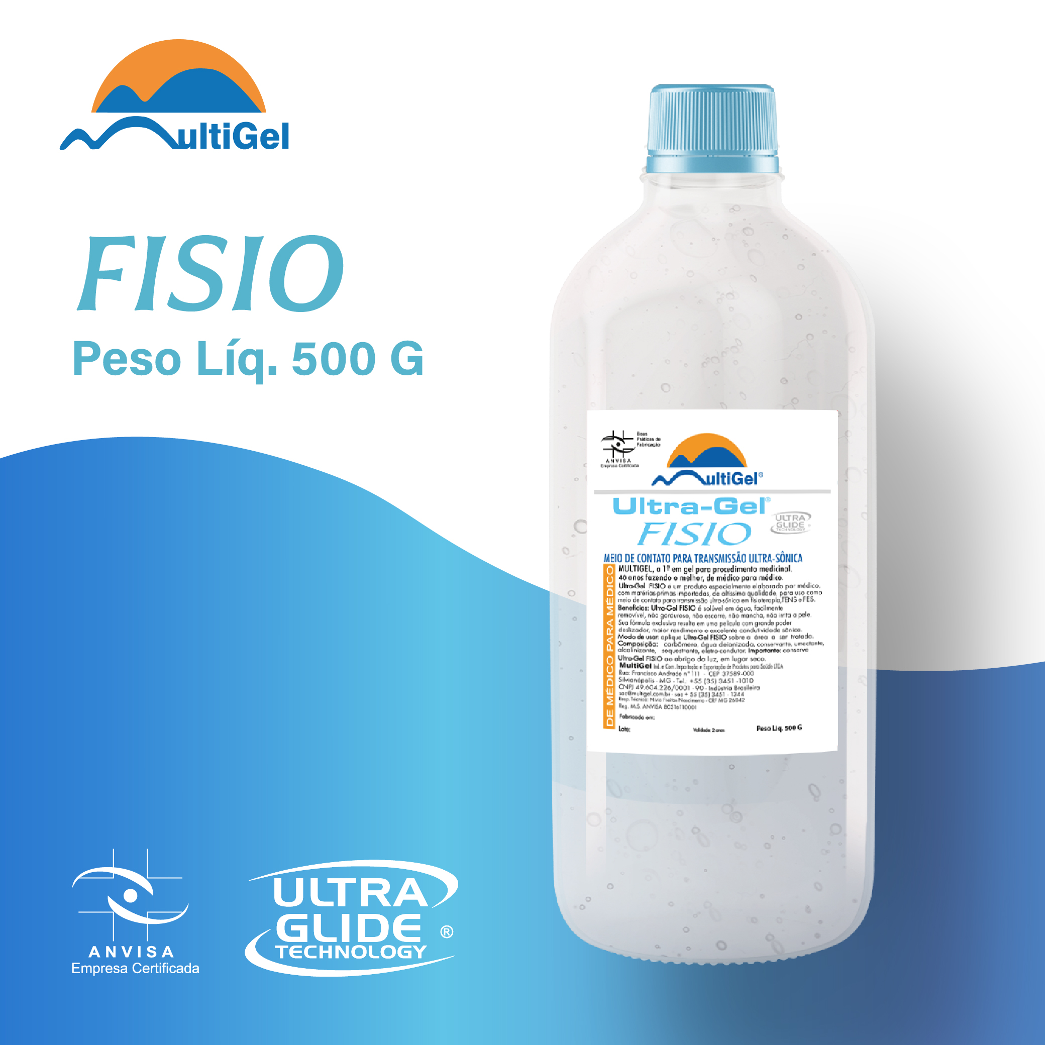 Ultra-Gel FISIO é um produto especialmente elaborado por um médico, utilizando matérias-primas importadas de altíssima qualidade, destinado ao uso como meio de contato para transmissão ultrassônica em fisioterapias, TENS e FES.